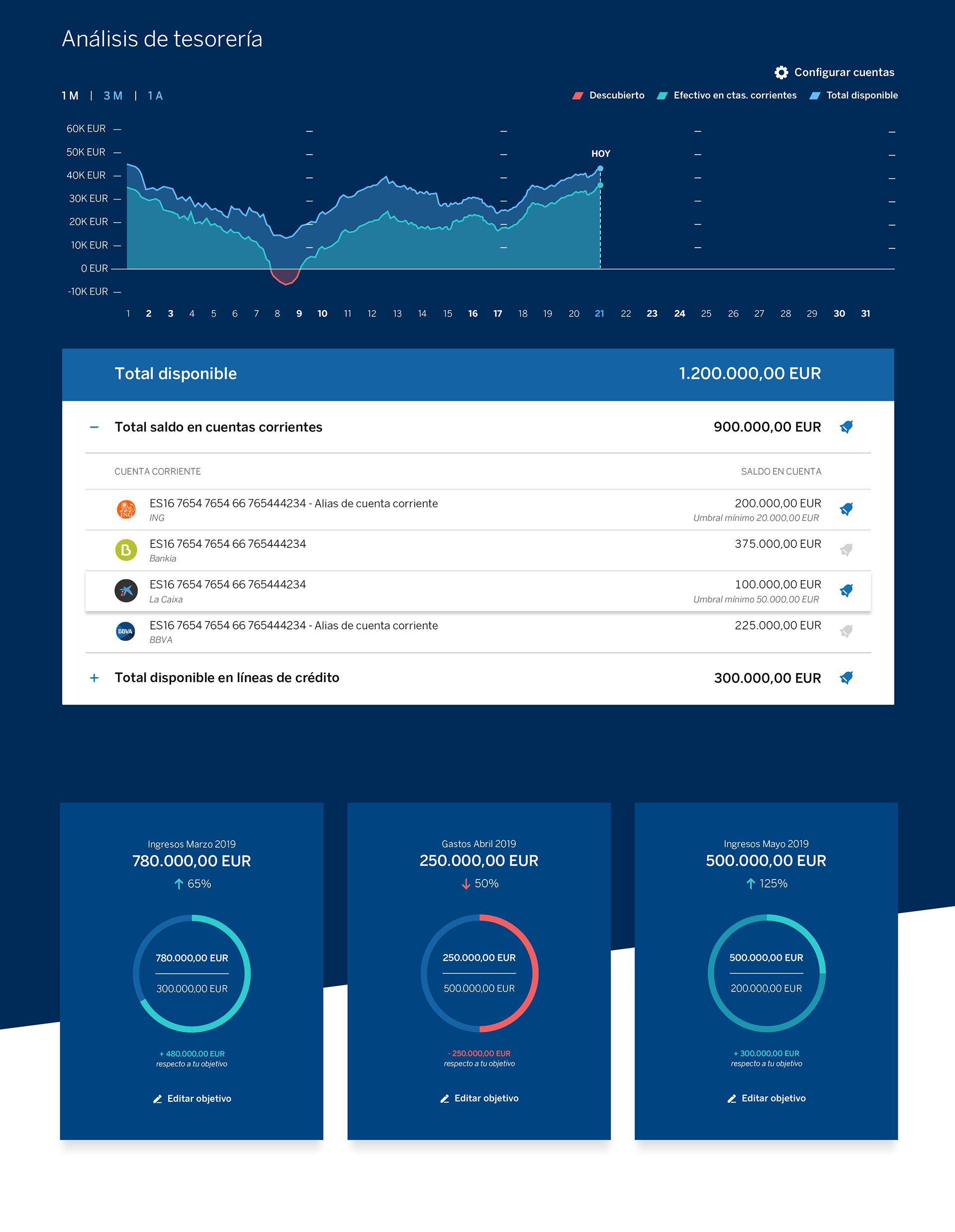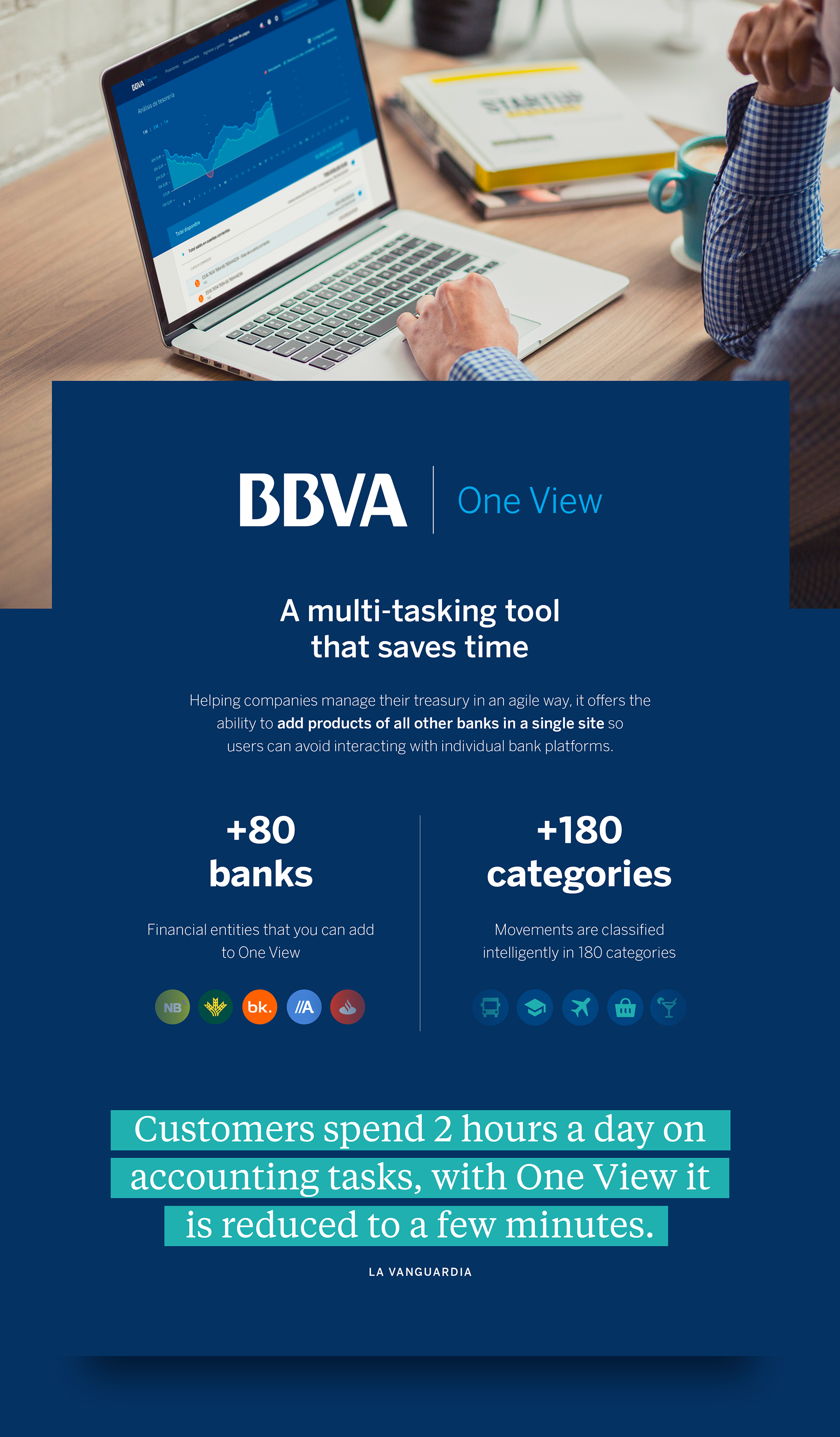 BBVA One View is a multi-tasking tool that saves time helping companies manage their treasury in an agile way. It offers the ability to add products of all other banks in a single site so users can avoid interacting with individual bank platforms.